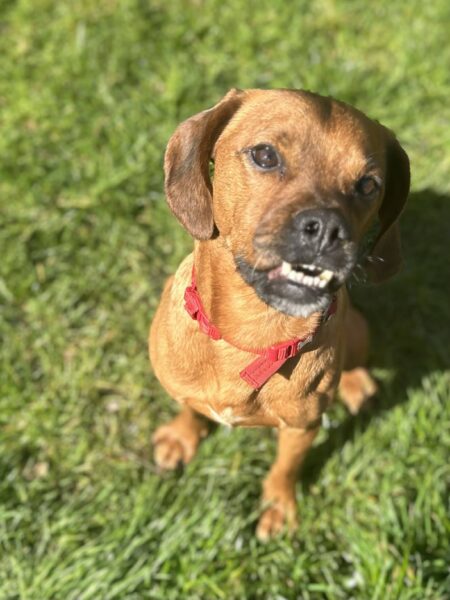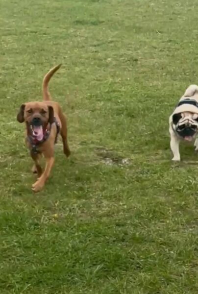 Well he is a really sweet little chap, can be initially nervous of men and fast movements in new people, we suspect some rough handling in his past. He loves other dogs as you can see, and although he has pug in him, he has slightly longer legs and a very athletic body and loves running and playing 🐾